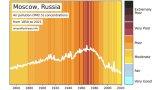 Диаграммы проекта используют среднегодовое значение, чтобы учесть подъемы и спады из-за изменений погодных условий в течение года и упростить сравнение между местами. Однако исследователи отметили, что даже кратковременное воздействие очень высоких уровней может быстро вызвать острые последствия для здоровья, требующие медицинского лечения.