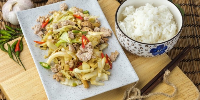 Qovurilgan tovuq filesi yumshoq sabzavotlar bilan pishirilganda ajoyib ta’mni hosil qiladi. Ushbu qovurilgan tovuq go‘shti va karamdan tayyorlanadigan taomga achchiq qalampir qo‘shilsa yanada foydali va mazali taomga aylanadi. Unga ta’bingizga qarab boshqa sabzavotlarni ham qo‘shishingiz mumkin.
