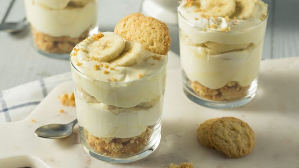 - Mahsulotlarni stakanga qavatma-qavat joylashtiring: pechenye, qatiq, banan. Xuddi shu holatni yana takrorlang.